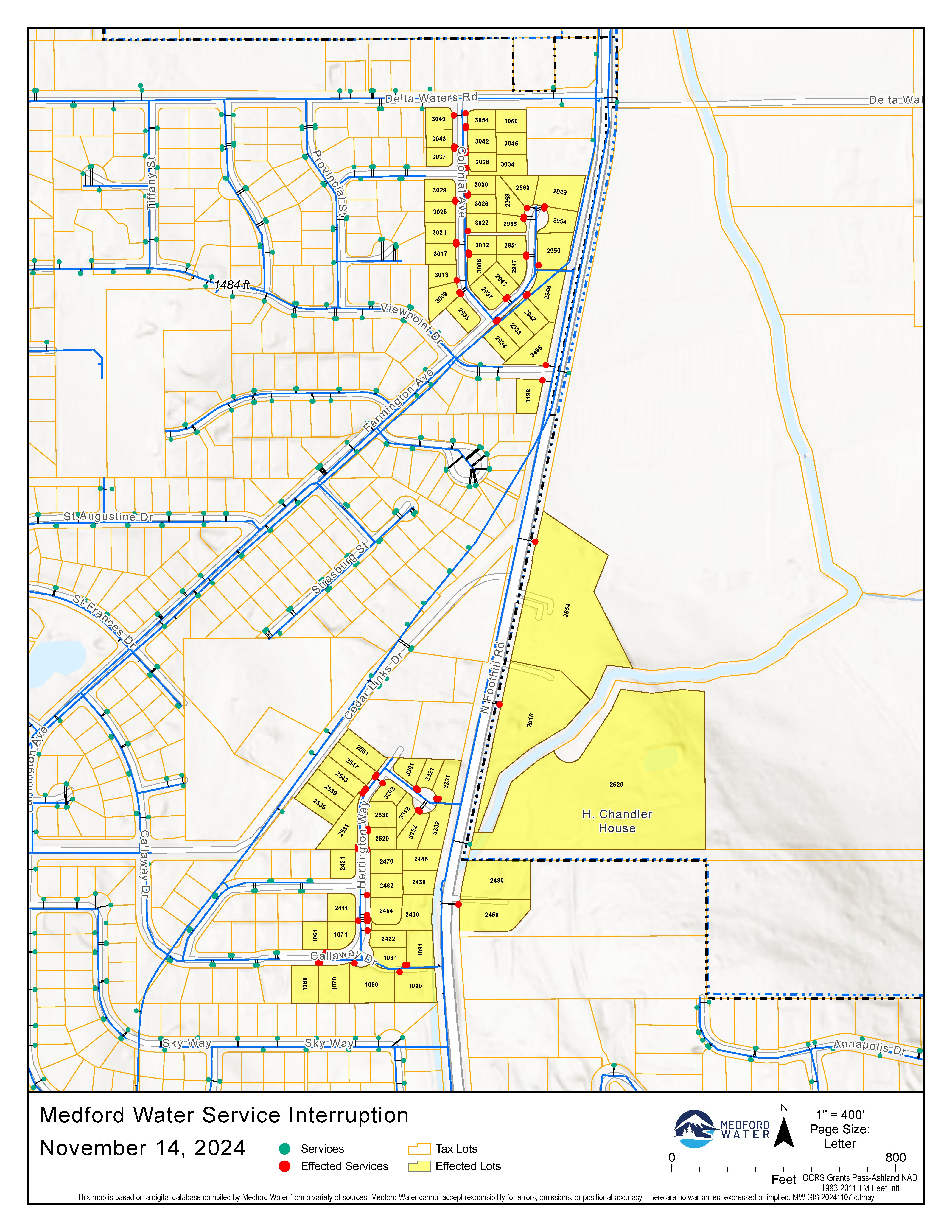 Due to waterline work as part of the Foothill Road Improvement Project, water service for customers in the Foothill Road area near Delta Waters Road will be interrupted on Thursday, November 14th, 2024, from approximately 8 a.m. to 4 p.m. Customers affected by this interruption are shown on the map below, and have been notified.